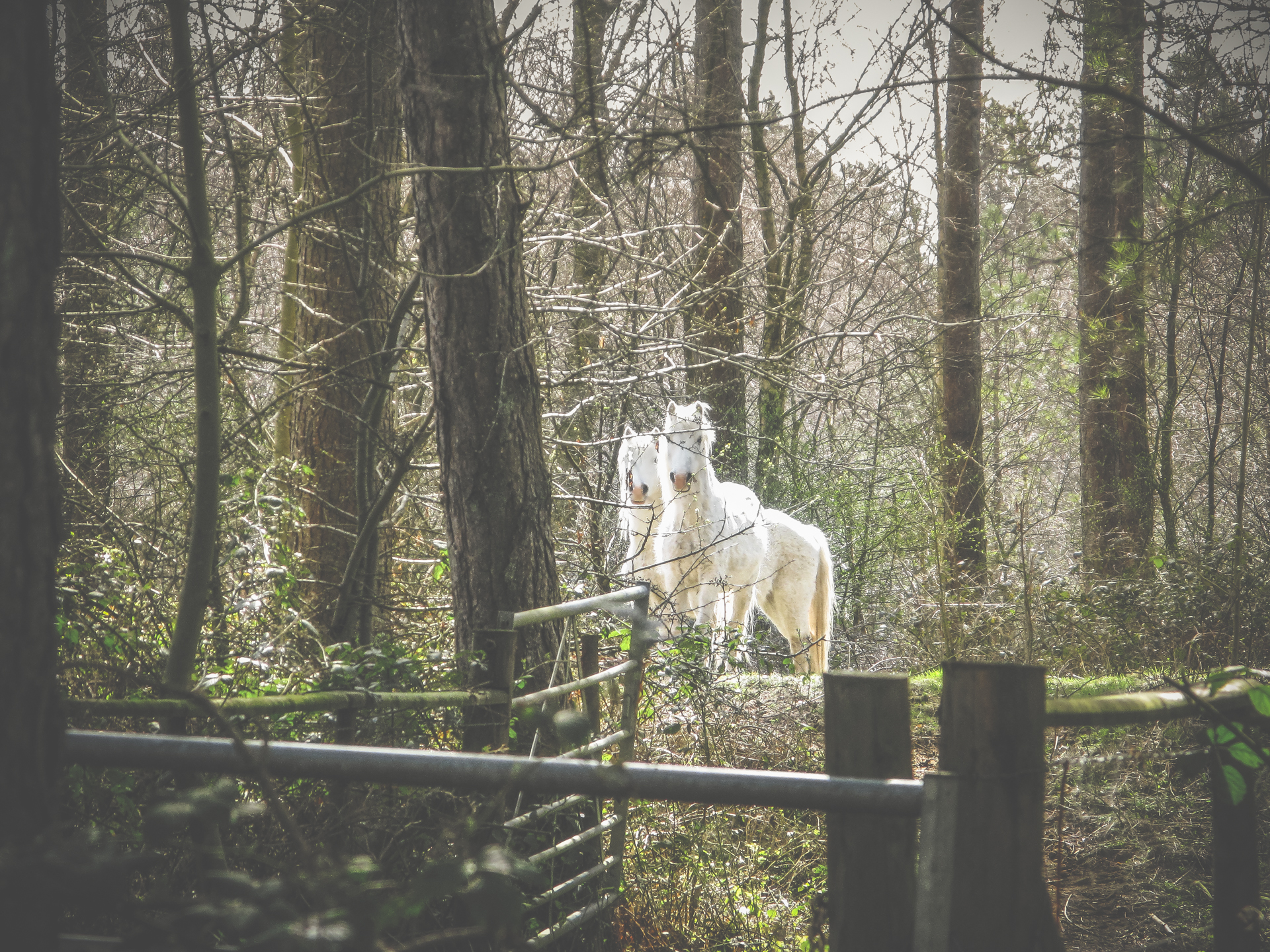 Walking in Wales we came across these two beautiful white horses happily playing. Noticing us, they turned to watch as I took this image. It is a fantastic Image and makes a stunning print.
